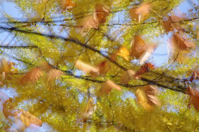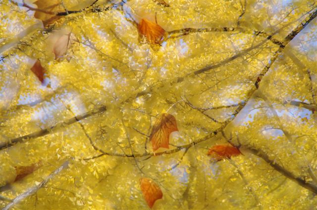 そこでレンズを上のほうに向けて、イチョウの木々を背景に、落葉寸前の風に舞うプラタナスの葉の動きを撮ってみました。クリックして少し拡大するとわかりやすいかな。
