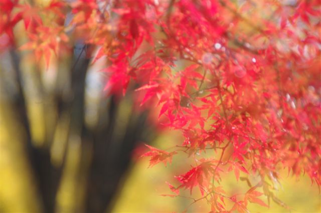 すこしモミジも赤くなっているので、イチョウの黄色は背景のベースカラーにして、赤いモミジと緑のモミジを撮ってみました。