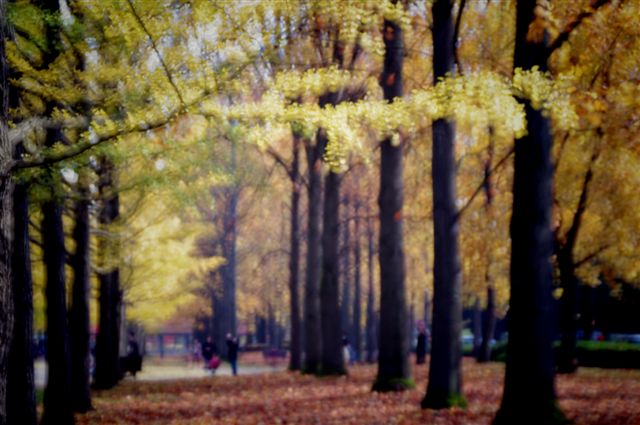 昼前に早速公園のイチョウ並木に行ってみると、けっこうな人で賑わっていて、並木の全体像を写そうとすると、どうしても何人もの人が写ってしまいます。