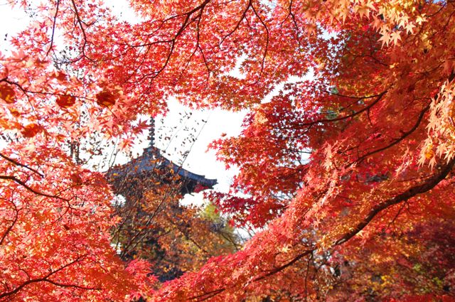 本堂わきの大モミジは今が見ごろ。午後3時頃がベストの時間。三重塔をバックにモミジのジャングルでこんな感じ。