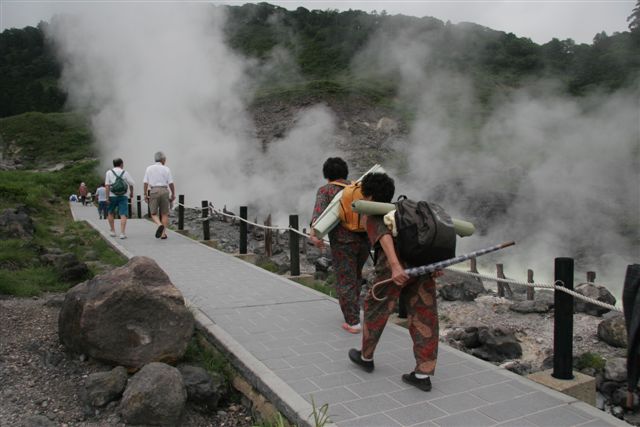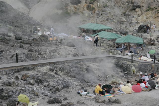 テントの中に限らず、遊歩道付近のあちこちの地熱の高い場所を選んで、思い思いに岩盤浴を楽しんでいる光景は、まるで山の中のリゾート地。