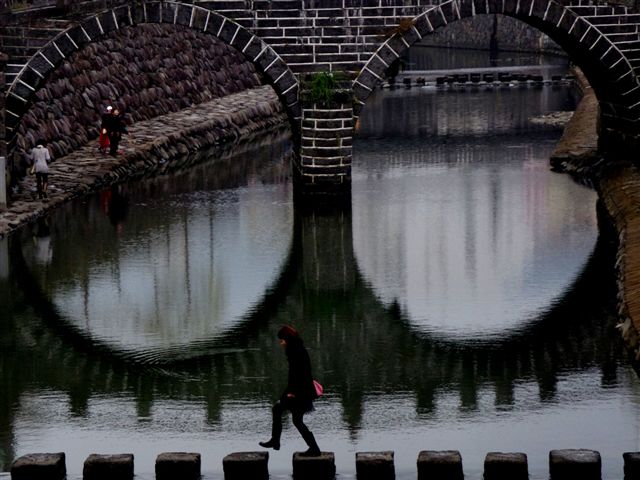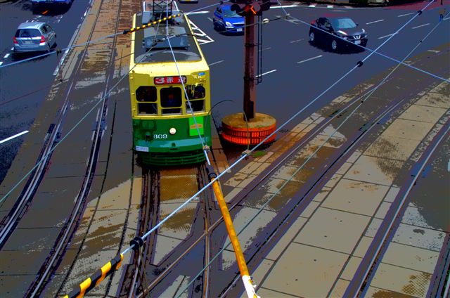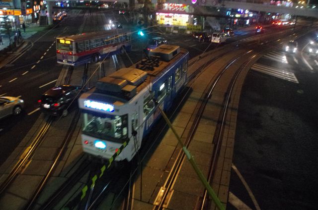 長崎駅前の横断歩道橋の上からは、線路が二方向に分かれていて、電車と線路と車を俯瞰で撮ることができます。