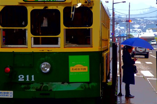 電停で傘をさした人が待ち合わせ?