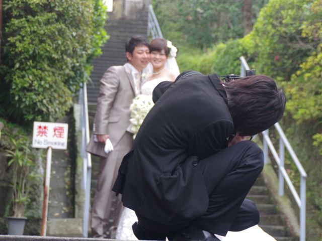 ブライダルサロンのオネェさんとカメラマンが付っきりで、石段を登ったり降りたり。