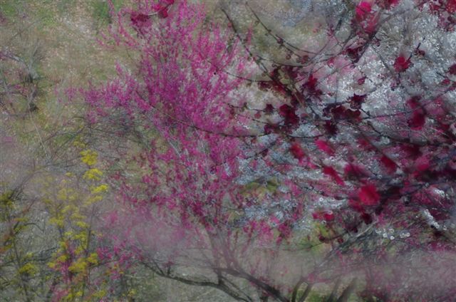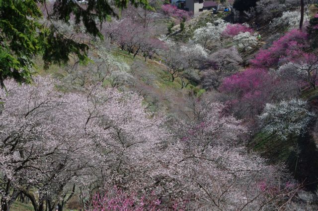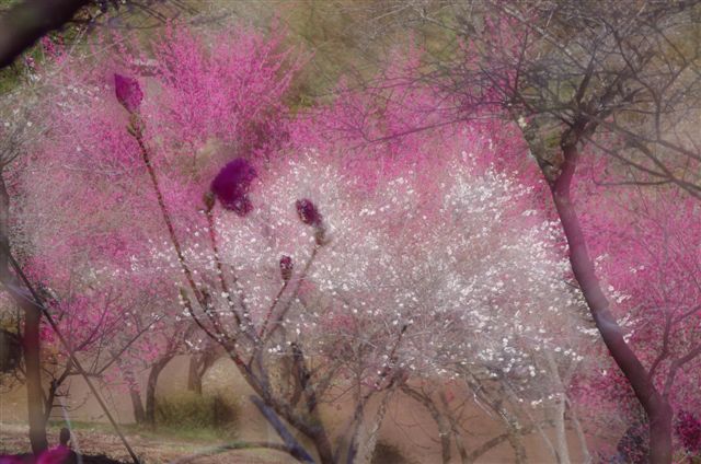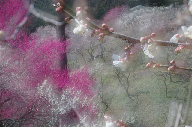 白梅、紅梅、紫に近いような濃い色の紅梅、山茱萸の黄色、玄海ツツジの白と濃いピンク。