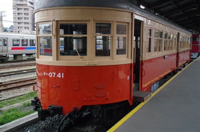 キハ07-41で、そのスタイルは前面が半円柱形の曲面で、今では見られないスタイルです。