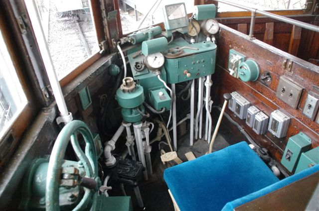 運転席はご覧のとおり、バスやトラックと同じクラッチを踏んで変速するタイプで、とても列車の運転席には見えません。