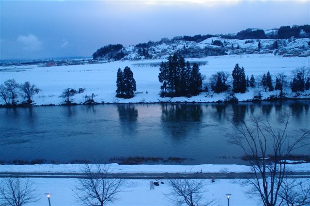部屋の大きな窓からは、眼下にとうとうと流れる最上川の雪景色の絶景が見られ、対岸には見渡す限り雪の田園風景が広がっています。