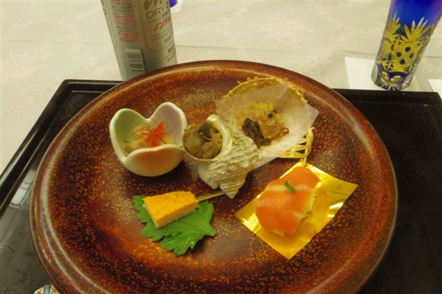 写真は一例で最初に出てきた前菜ですが、右下は大トロの握り、真ん中はサザエ、左下は田楽の雲丹焼き。