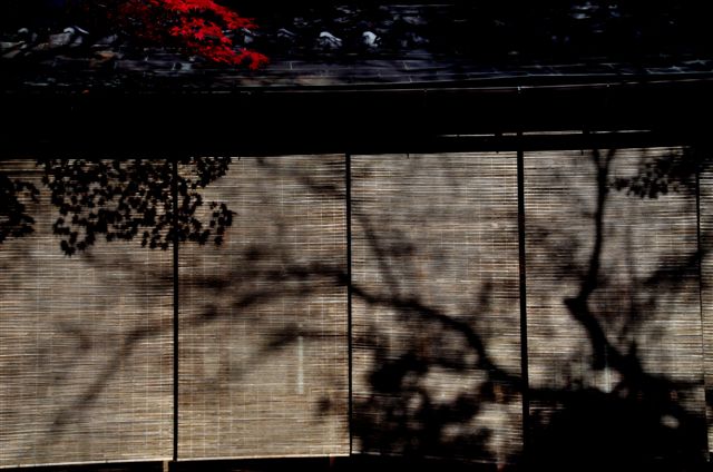 庭園内の建物の簾に木々の影が映って、水墨画の描かれた一双の屏風のように見えたのですが、誰もレンズを向けていません。