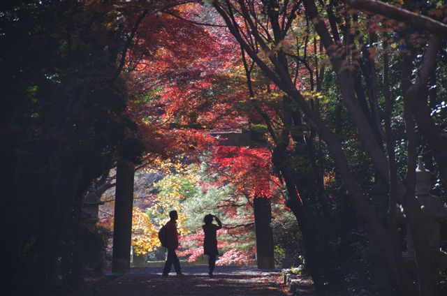 もう時期的に紅葉の写真は撮るほどでもないので、参道の鳥居の下のアベック(死語)いやカップルを。
