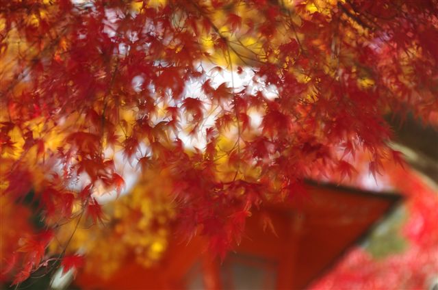 境内の最奥部に行くと、日当たりのせいでそこだけ紅葉が遅れたのか、本当に真っ赤なモミジの塊がまるで真紅の振袖のように広がって、別世界の空間がありました。