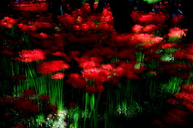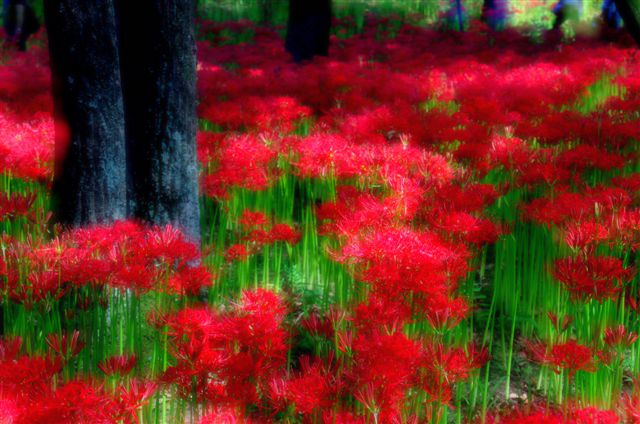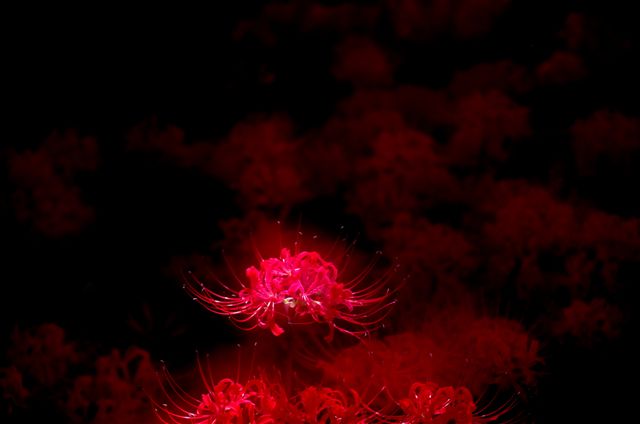たぶんそのせいなのかわかりませんが、普通に撮れた彼岸花の写真のコントラストを強くすると、赤と緑の組み合わせは他の色との組み合わせよりもより強く目立って、いっそう妖しげな雰囲気になります。