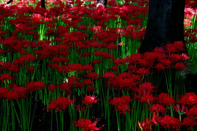あまり明暗差のない場所の彼岸花はこんな感じに、それぞれに赤はより妖しげに、緑はよりその赤を引き立ててくれます。