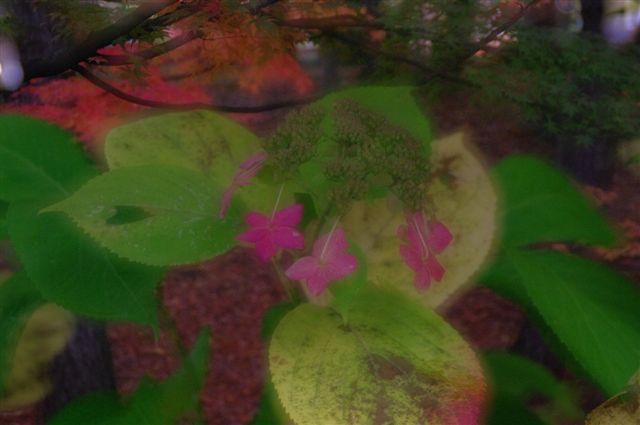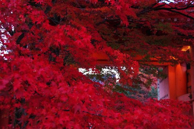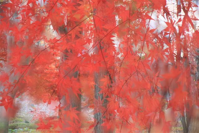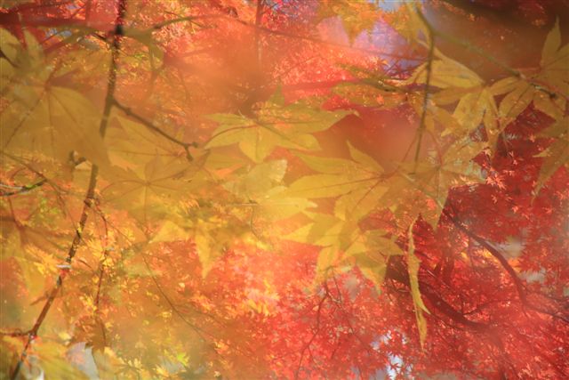 黄色のモミジと背景の赤いモミジで、、まるで紅葉の森。