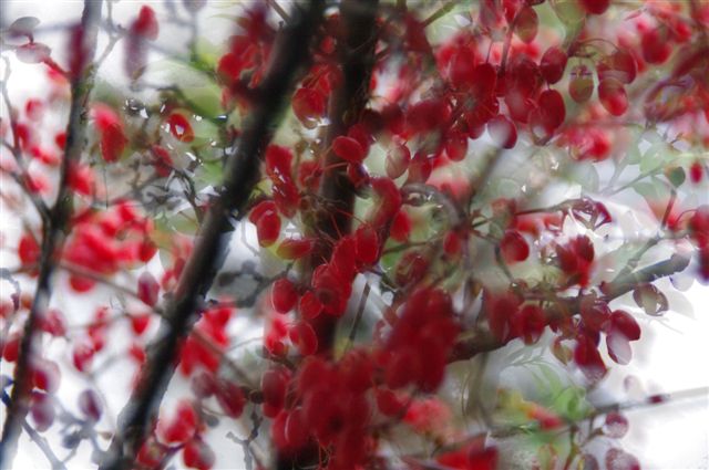 これは山茱萸(さんしゅゆ)で、梅の香りに誘われる時期に黄色の小さな花をたくさんつける、早春を代表する花木のひとつですが、秋にはグミのような真っ赤な実をこのようにたくさんつけるのです。