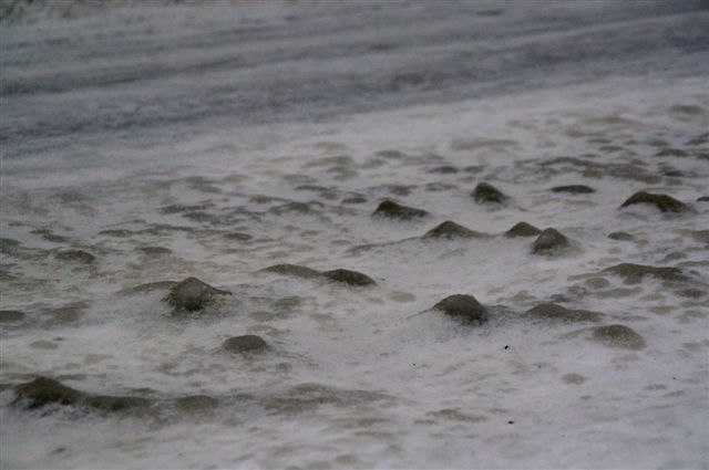 山形市内でも雪の多い職場付近の道路は、ここ2日ほど積雪がなくて、圧雪状態の日中は少し表面が融けて、夜に凍ってを繰り返し、結果いたる所でこのような凶器のように尖った氷の路面になっています。