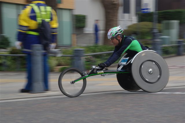 パトカーの先導に続いて最初にやってくるのが車椅子ランナー。
