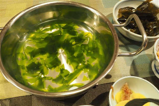 右上の黒っぽいワカメが、熱湯にちょっと潜らせるだけで若葉色に変身。
