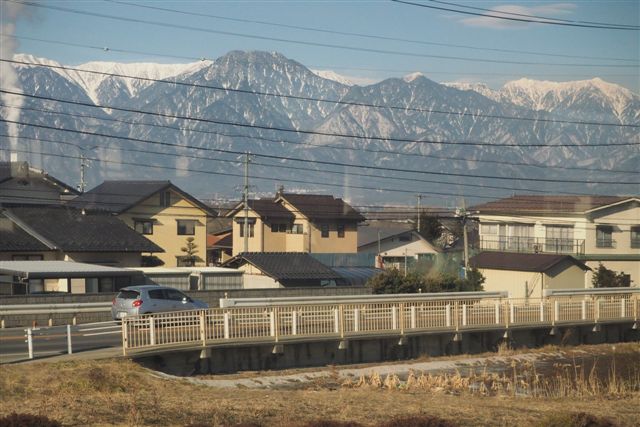 住宅地になると、背後にまるで屏風のようにそびえる北アルプス。