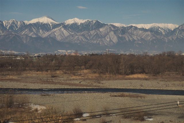 松本が近づくと右手には北アルプス3000m級の山岳群。