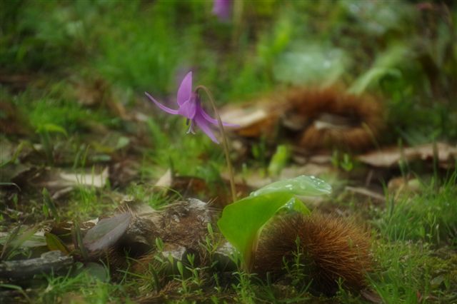 ここは山の斜面の栗の林の中に、一面にカタクリが咲いていて、早咲きから遅咲きまでこれからしばらく楽しめそうです。
