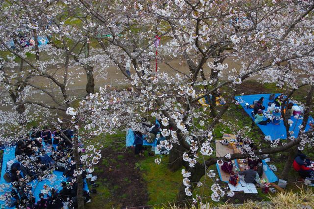西日が沈む前に岩手公園の撮影スポットで、花見光景を俯瞰撮影。
