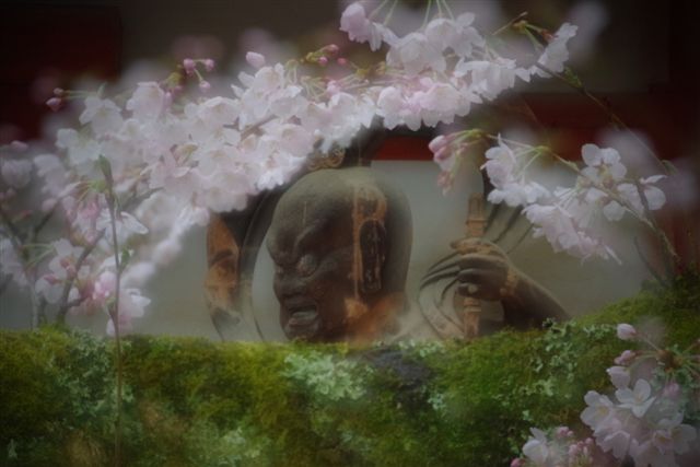 醍醐寺の仁王門をくぐる前に、桜の古木を前景にして、仁王像をパチリ。