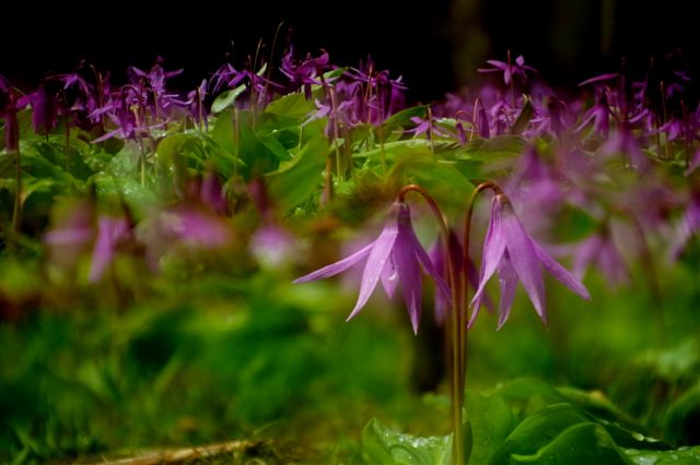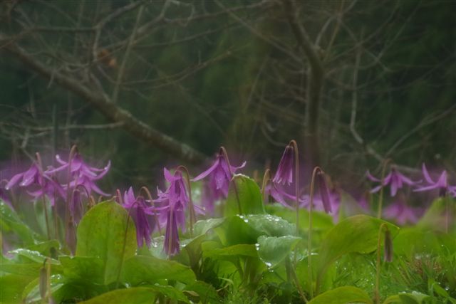 背景を暗く落とすと、カタクリの花が小さなランプみたいに浮き上がってきます。