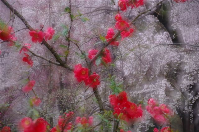 手前の真っ赤なボケ(木瓜)の花が、桜の林のアクセントになります。