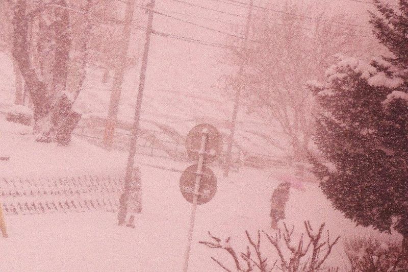向かい側の中学校のグランドも真っ白で、その前を一人で歩くばあちゃん。