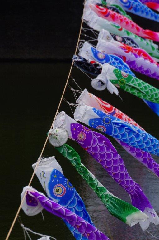 次に明るい青空が写っている部分の鯉のぼりを俯瞰で撮ってみますが、状況説明のために左上に少しだけ緑の木々が写っている様子を入れてみました。