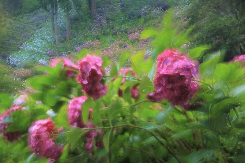ピンクの紫陽花と背景の斜面の青い紫陽花です。
