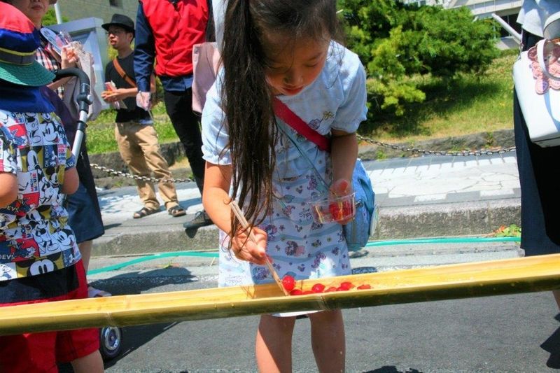 流れてくるサクランボを割り箸で直接つかむのは子供には難しいようで、こんなふうに箸でダムを作ってサクランボを溜めて、そこから一粒つかむのがコツのようです。