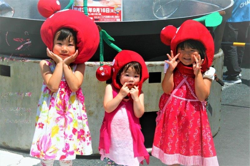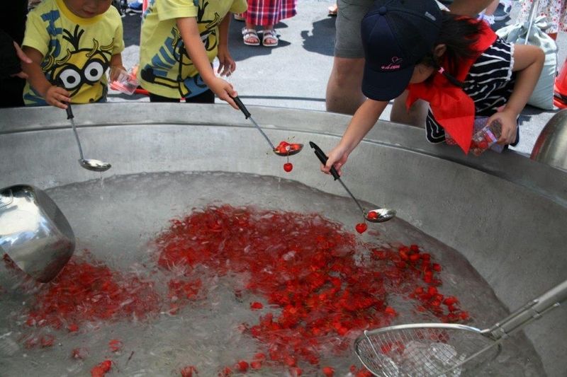 箱詰めされた高価なサクランボを、デカいいも煮鍋の中の氷水に大量に投げ入れて、未就学児にお玉ですくわせる「さくらんぼすくい」。