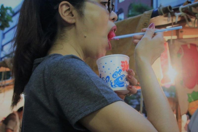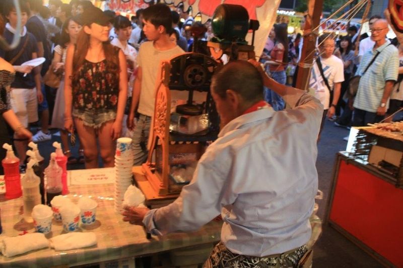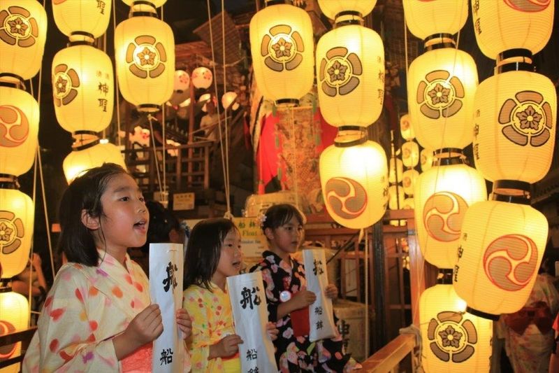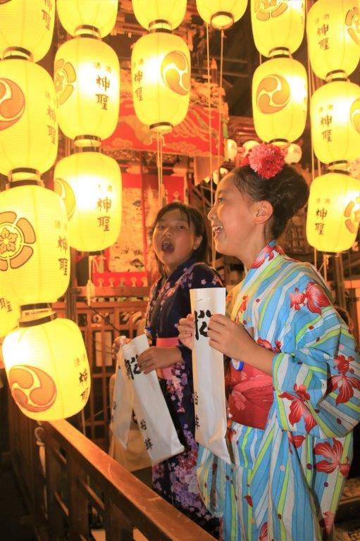 正面からの写真ではありませんが、この方が背景に提灯が入って、祭りの雰囲気が出ます。