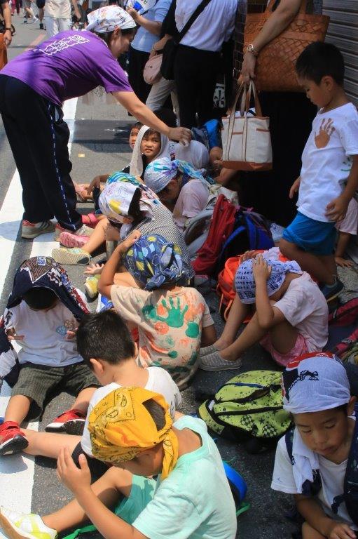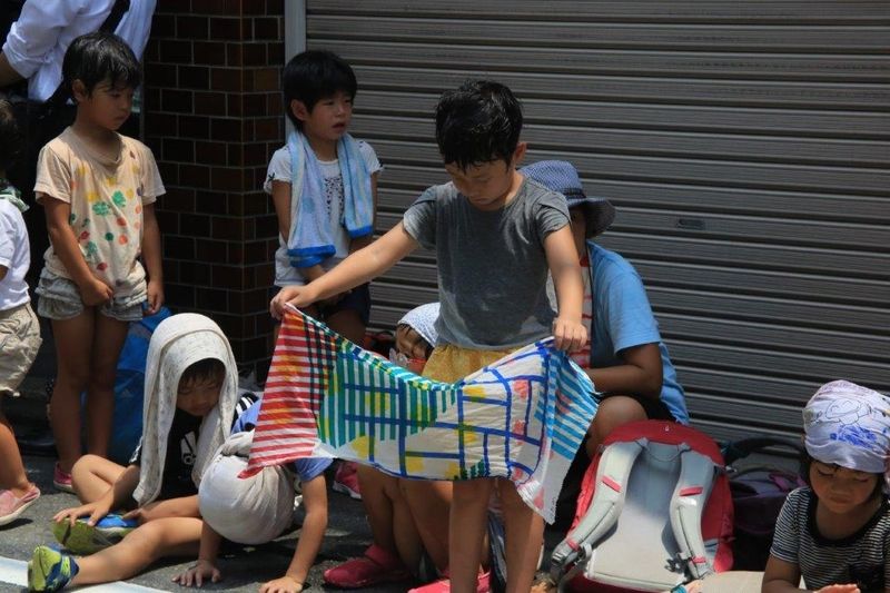 暑いので帽子代わりかなと思って見ていたら、どうやら手ぬぐいの上から先生たちが水をかけているようです。