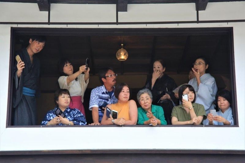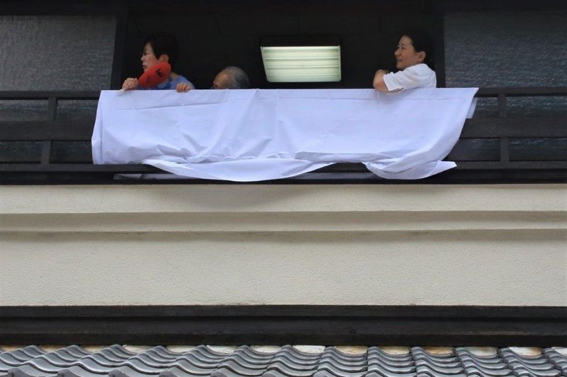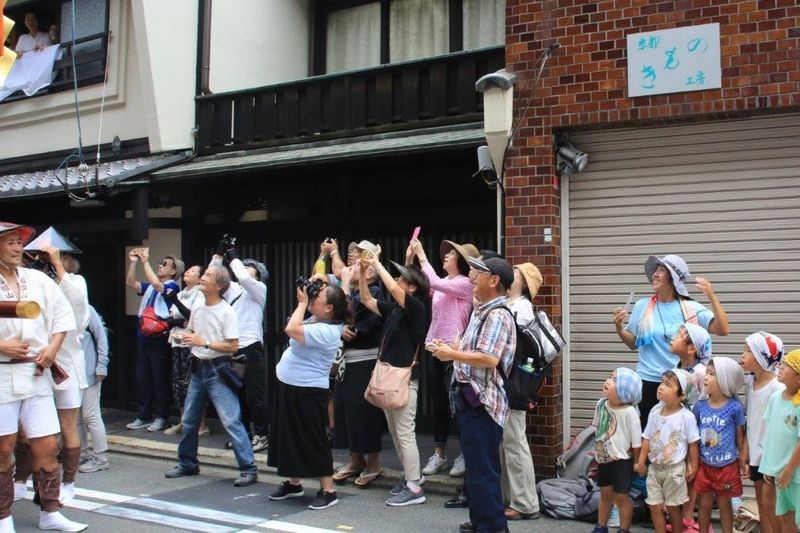 新町通りの見どころは、自宅二階の窓を全開にして、特等席で山鉾を待つ地元の人たちの様子です。