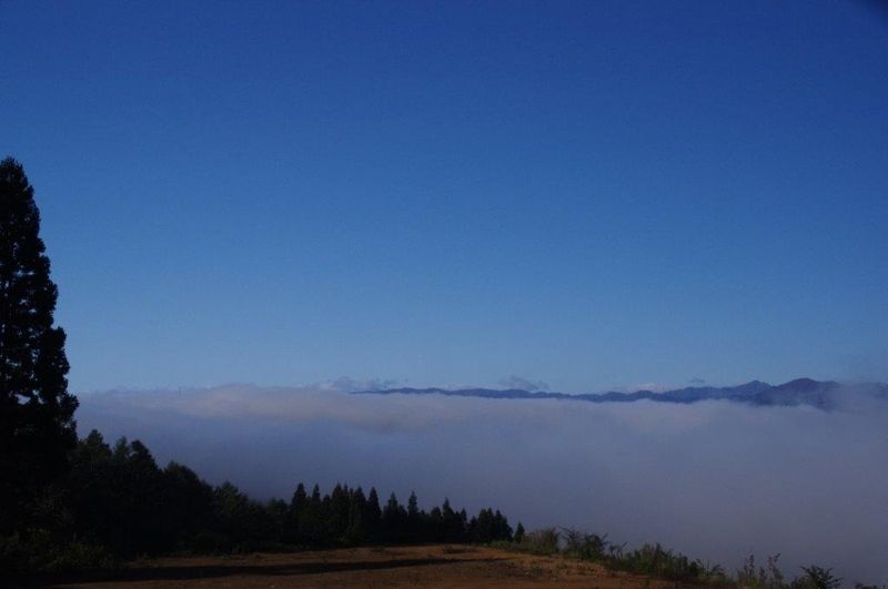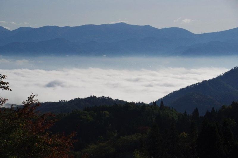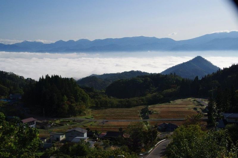 一路西へ車を走らせていくと、山形盆地の西側は一面の霧がかかっていて、その霧の上にこれから越えていく山が見えます。