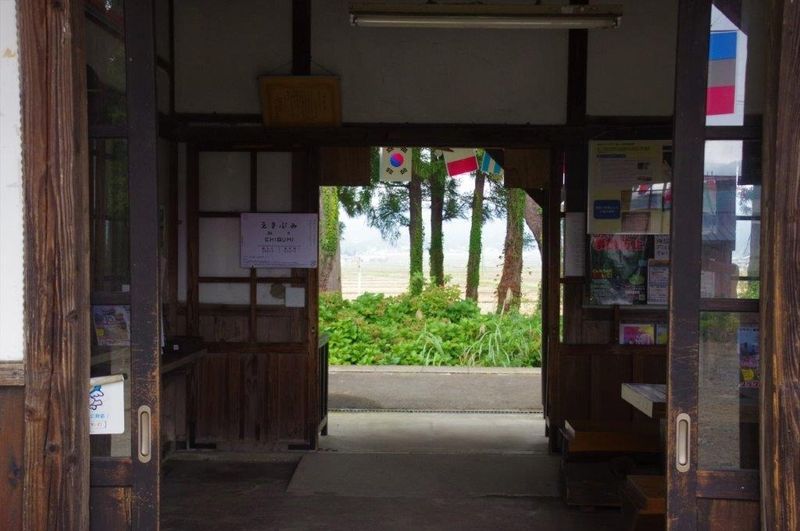 この日は祭りなので万国旗が飾られていますが、改札口の向こうは道路と田んぼです。