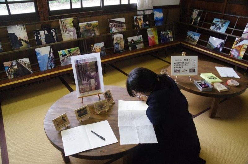 昔、何人もの駅員さんたちが働いていた場所は、今は畳が敷かれており、この日は地元の県立高校写真部のミニ写真展が開かれていました。