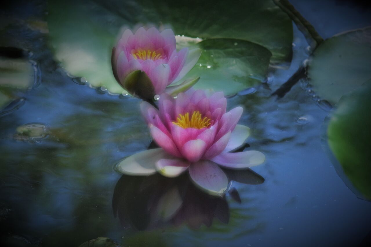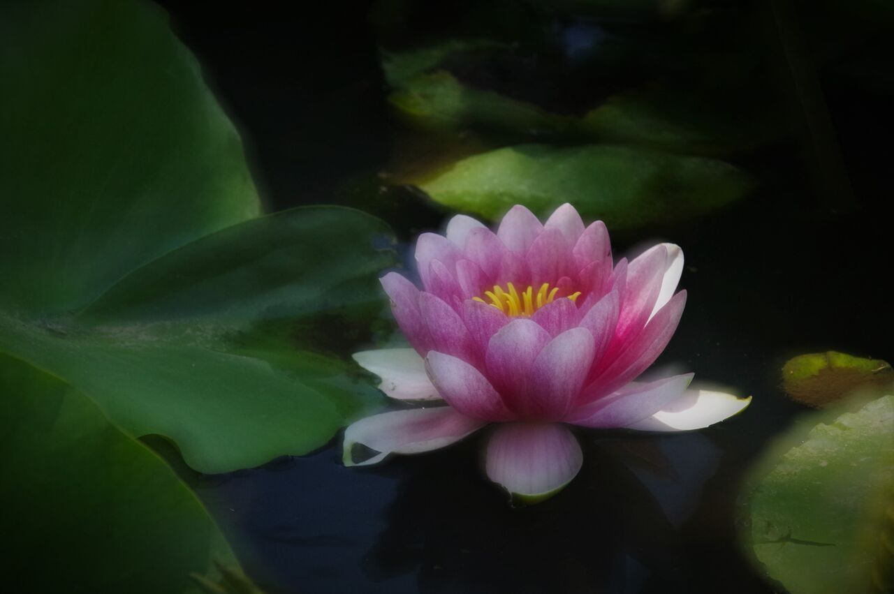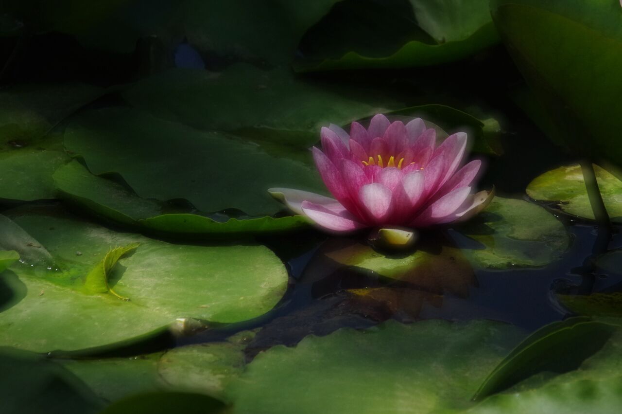今度はPLフィルターを目いっぱい効かせて水面の反射を取り除いて、水面を黒く落として、睡蓮の花だけを浮かび上がらせてみました。