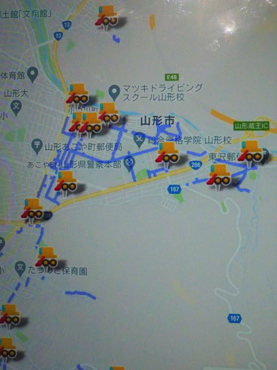 山形市役所のHPには「除雪作業車両公開マップ」というページがあって、15分毎ほぼリアルタイムで市内のどの道路が除雪されたか、除雪車が今どの辺にいるかを教えてくれるのです。