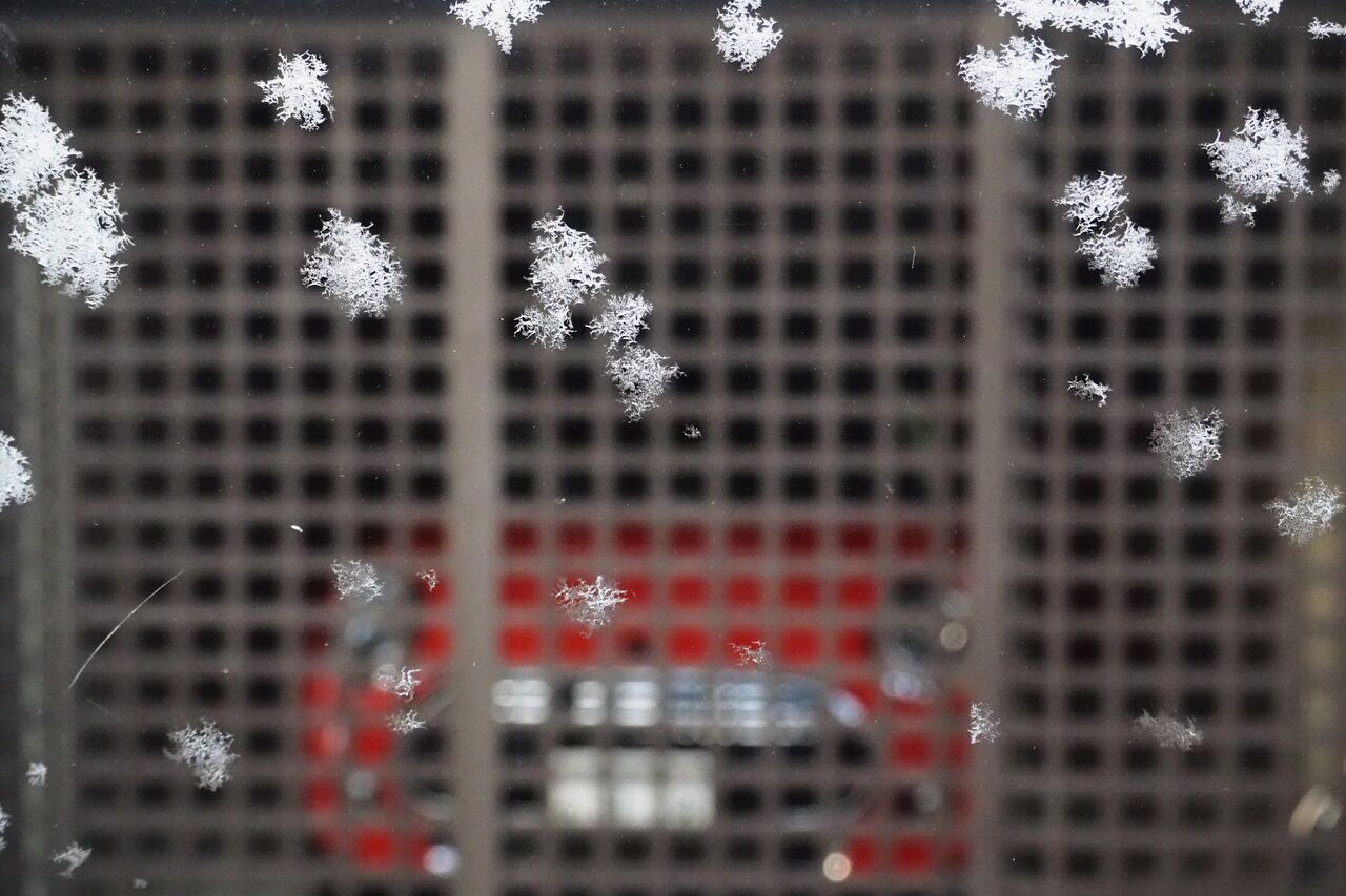 運転席の窓には、チラチラと降ったであろう雪が融けずに結晶状態で貼りついていたので、車庫をバックにパチリ。