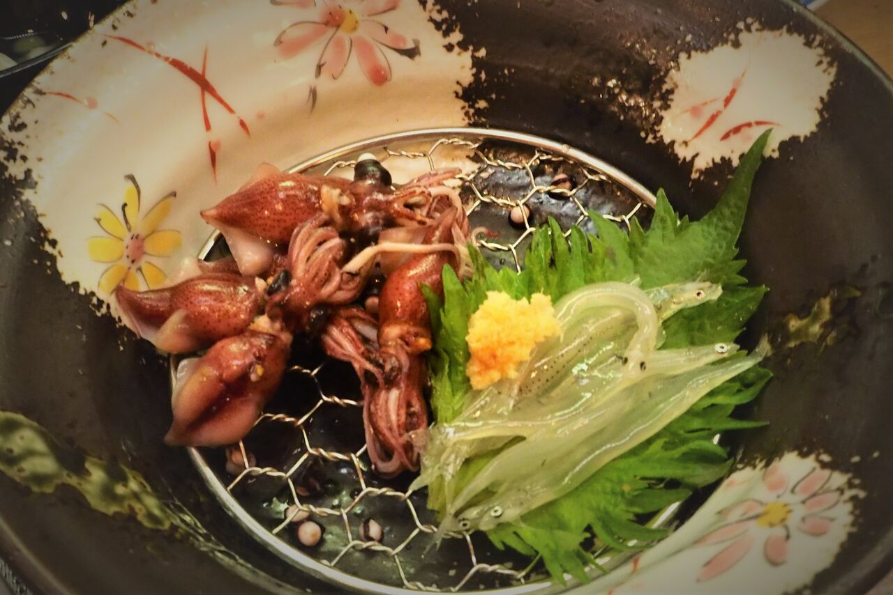 突き出しは温泉卵にネギトロにホタルイカとウルイの酢味噌和え。