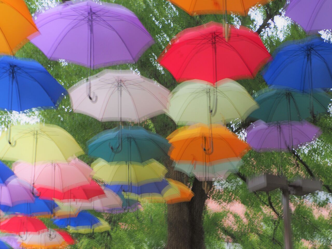 曇り空でなかなか写真にはならないのですが、小型三脚を立てて木々の緑をバックに傘だけ撮ってみました。