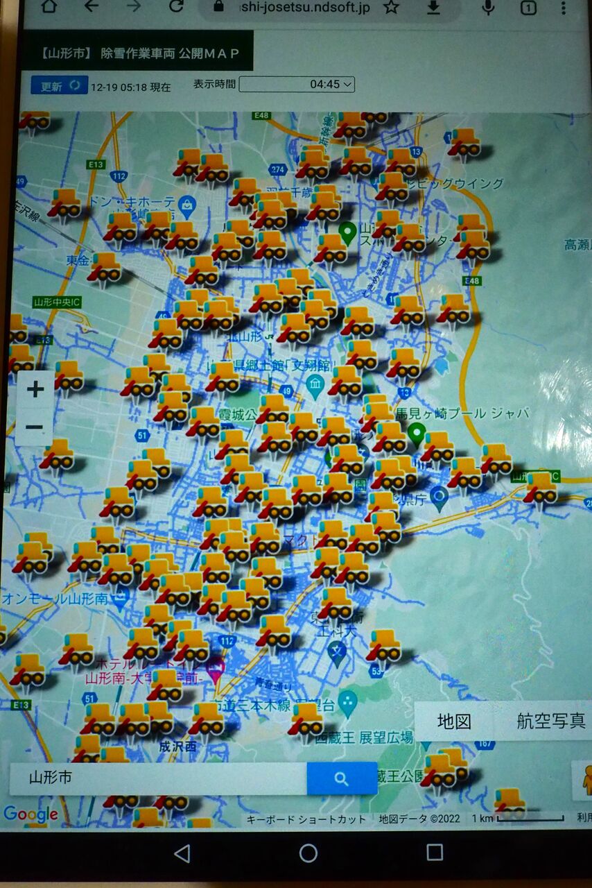除雪車出動のアプリを見たら、山形市内は除雪車マークで埋まっていました。