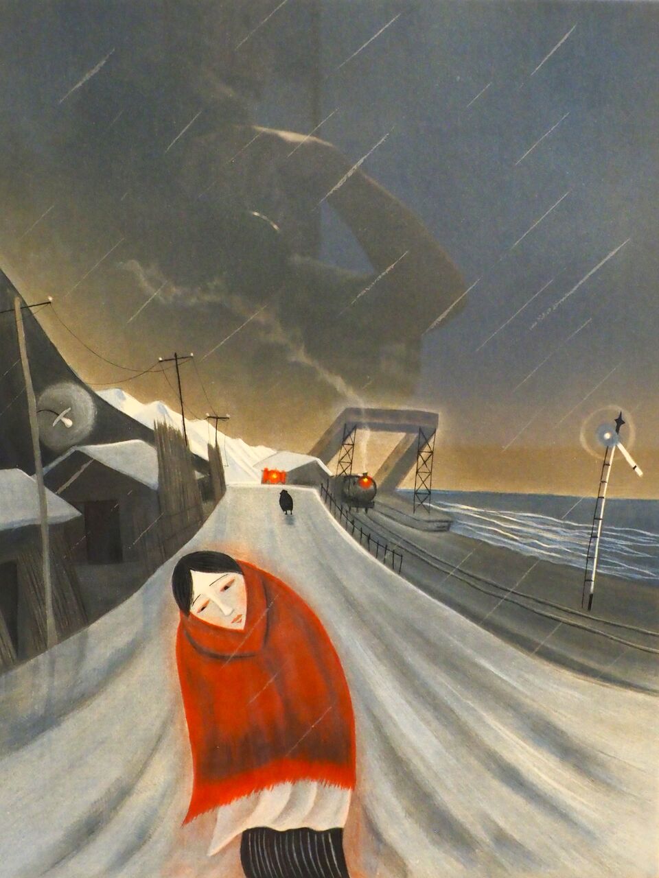 赤い角巻を纏った若い瞽女、海岸線の駅にはSLが停車して、哀愁列車でしょうか。