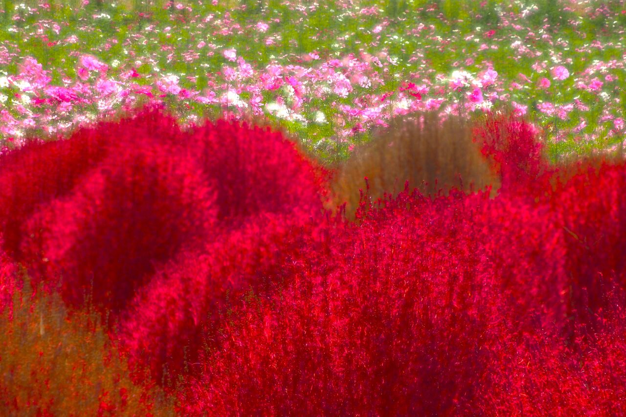 でもこれだけでは「わ~、きれい」だけの写真になってしまうので、まずはコキアとコスモスだけの写真を撮ってみました。