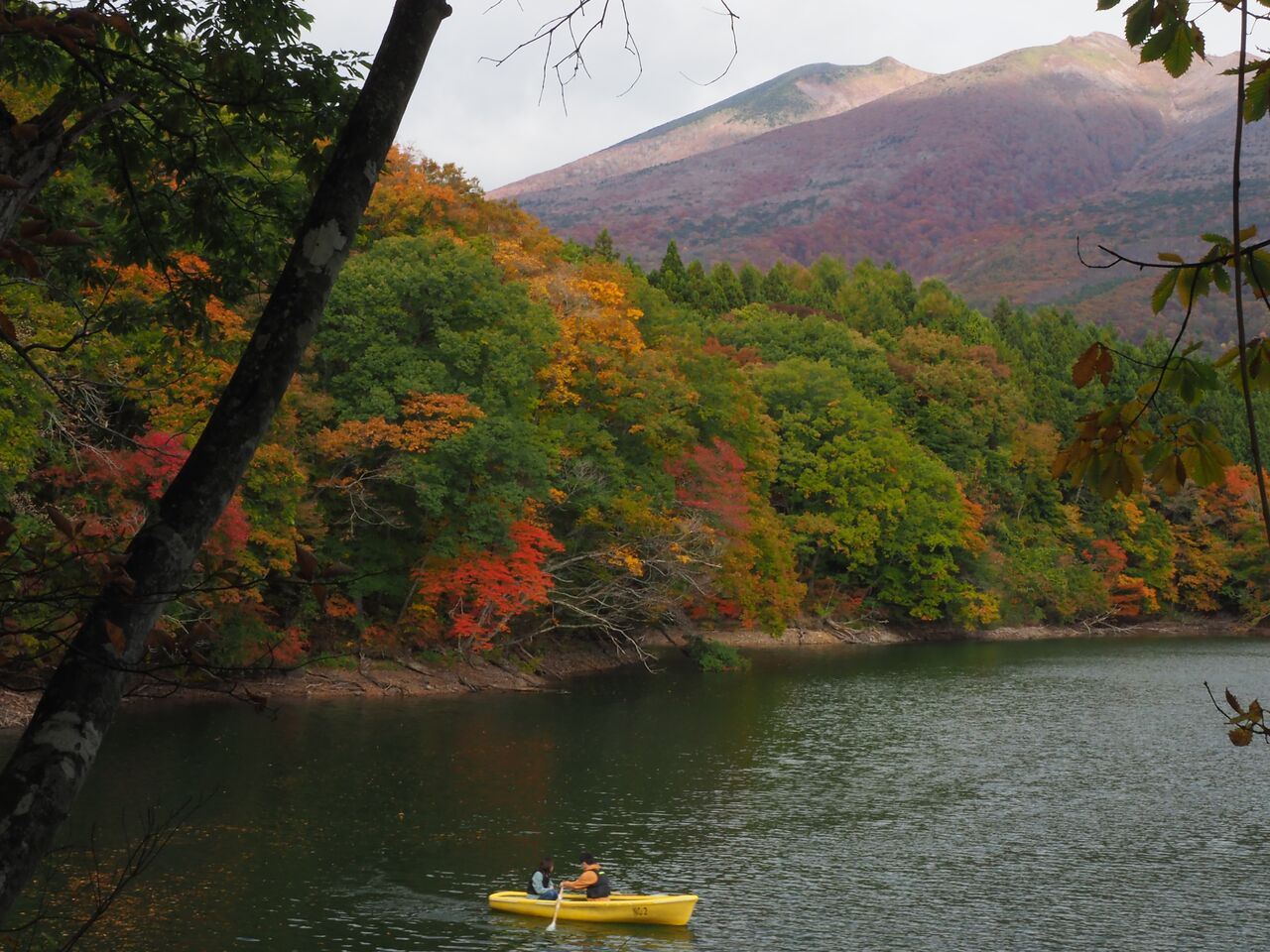 湖畔に一人たたずみ、一艘だけ浮かんでいたボートと不忘山の草紅葉。